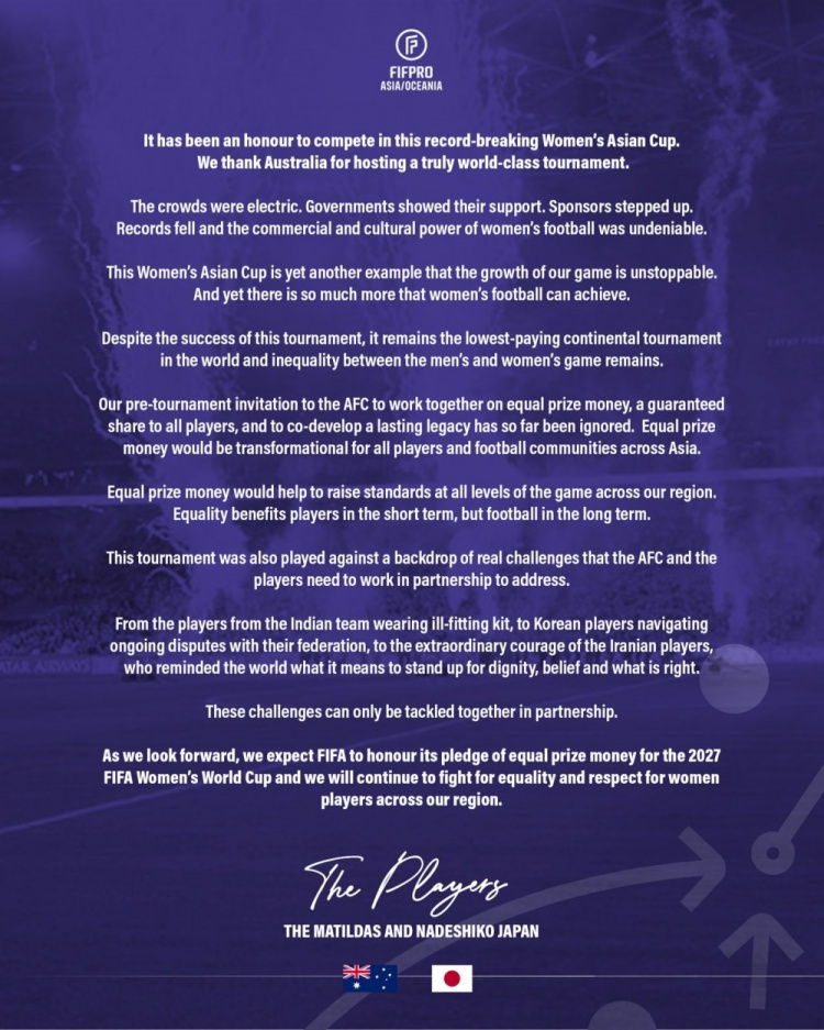 今日,FIFPRO(国际职业足球运动员联合会)官推更新,晒出了澳大利亚女足和日本女足要求提高奖金的共同声明。声明内容如下: